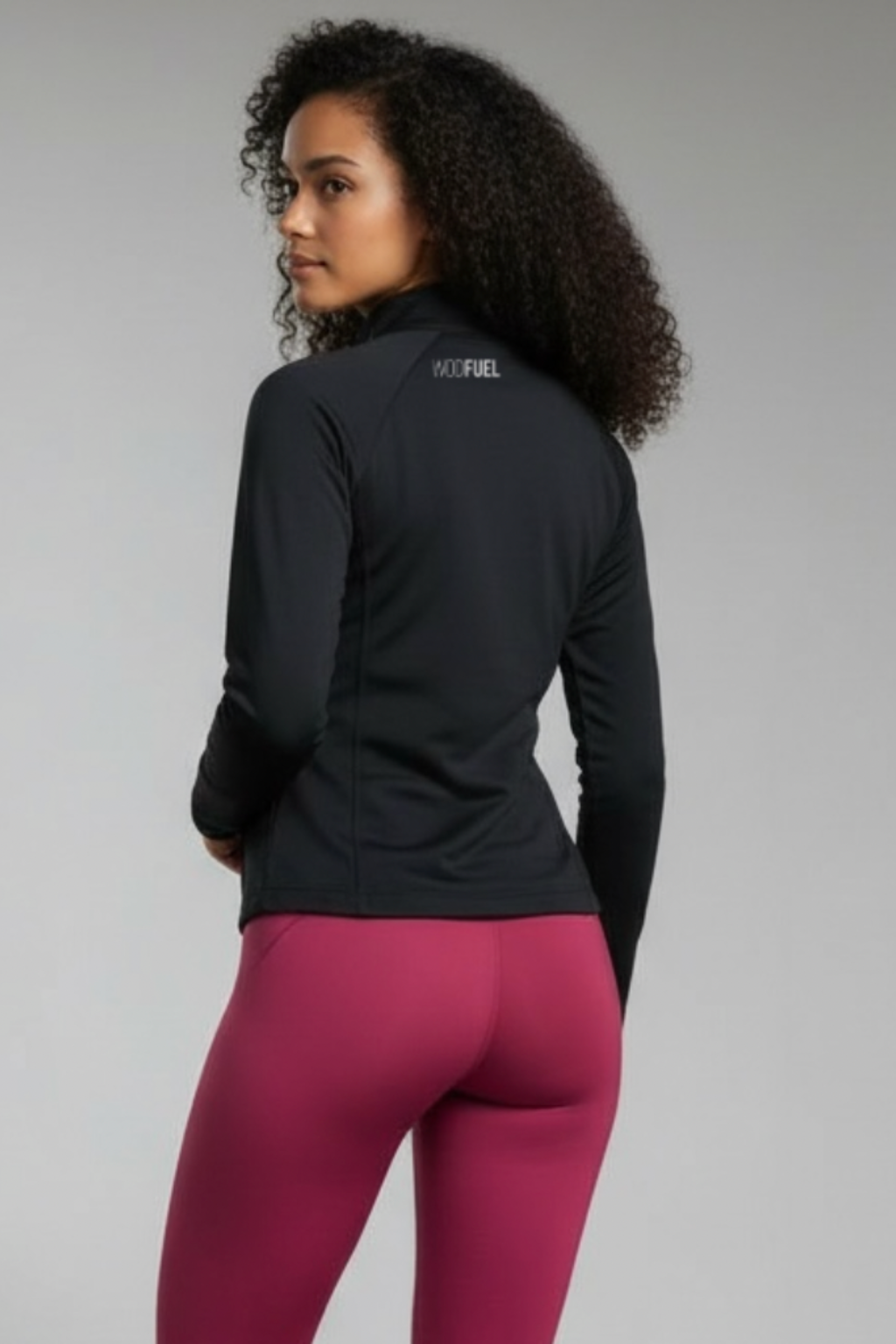 This women’s black jacket combines sporty elegance with high-performance design, making it ideal for CrossFit, gym sessions, or casual activewear. Crafted from soft, breathable, and flexible fabric, it provides a flattering fit that moves effortlessly with your body. The high collar and full front zipper offer a sleek, modern look while maintaining comfort and versatility. Whether you’re warming up, training, or layering post-workout, this jacket ensures you stay comfortable and stylish throughout your fitness routine.